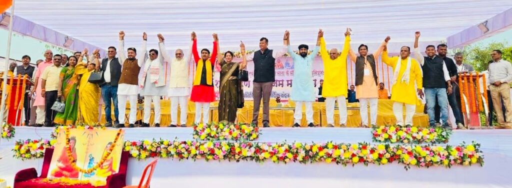 रायपुर । रायगढ़ जिले के ग्राम कोसमनारा में श्री सत्यनारायण बाबा जी, भक्त माता कर्मा-कृष्ण मंदिर स्थापना दिवस एवं साहू समाज के जिला पदाधिकारियों के शपथ ग्रहण समारोह में शामिल हुए, आज शिवरात्रि के पावन अवसर पर शपथ ग्रहण समारोह बिलासपुर संभाग के जिला अध्यक्षों और पदाधिकारियों का हुआ, और मुख्यमंत्री विषाणुदेव साय ने श्री श्री 108 श्री सत्यनारायण बाबा धाम के मंदिर प्रांगण में जनसुविधाओं के विस्तार के लिए 1 करोड़ 20 लाख रुपए के विभिन्न विकास कार्यों का शिलान्यास किया। साथ ही आज साहू समाज के भवन के लिए 50 लाख रुपए देने की घोषणा की ओर इस समारोह में मुख्यमंत्री विष्णु देव साय जी माता हंसमती देवी के साथ. मंत्री ओपी चौधरी, सांसद राधेश्याम राठिया. महापौर जीवर्धन चौहान , साहू समाज के प्रदेश अध्यक्ष डॉ नीरेंद्र साहू ,प्रदेश उपाध्यक्ष गण डॉ तिलक राम साहू, सत्यप्रकाश साहू, श्रीमती साधना साहू संगठन सचिव सुनील साहू, सयुक्त सचिव प्रदीप साहू,